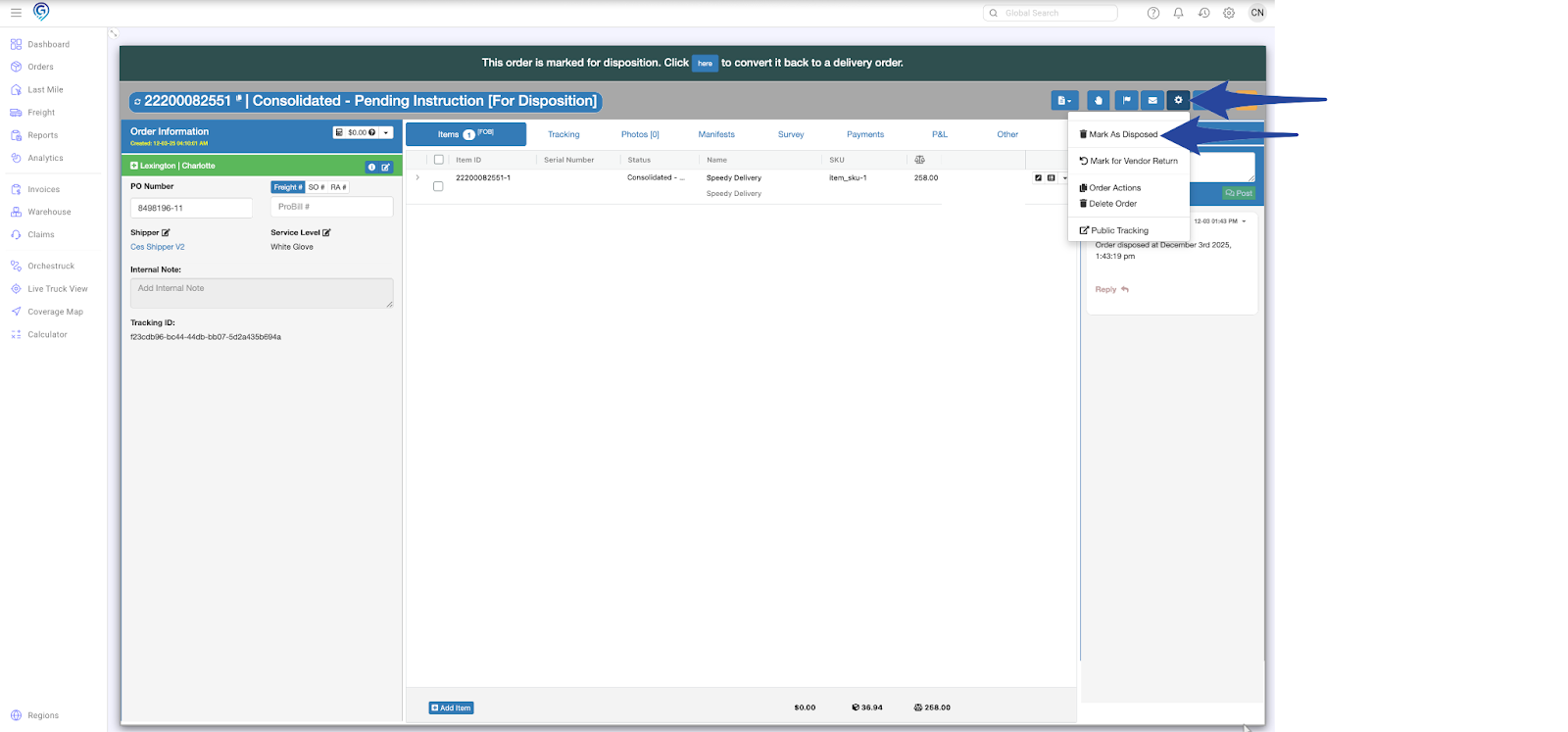Reopen the Order Actions menu and select Mark as Disposed
