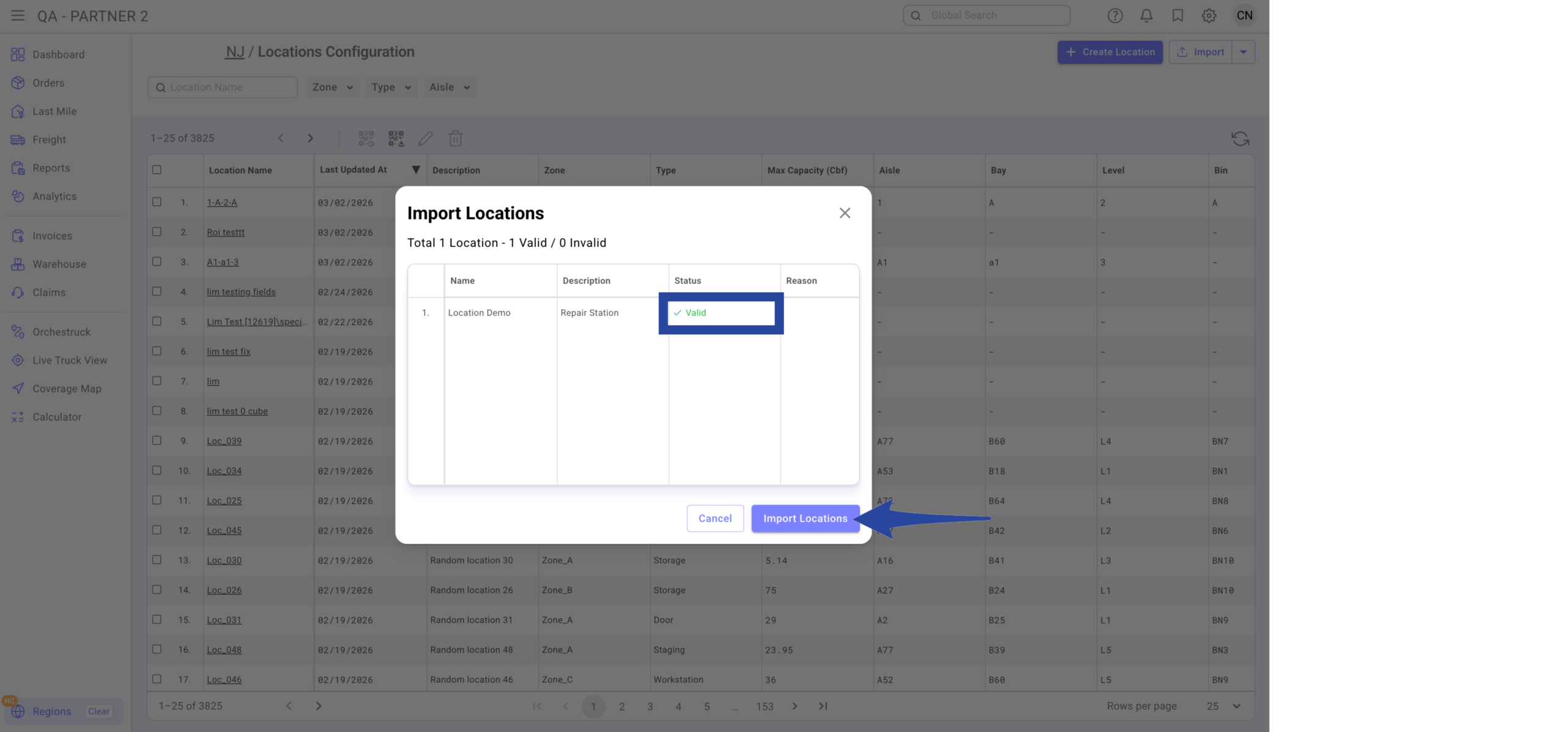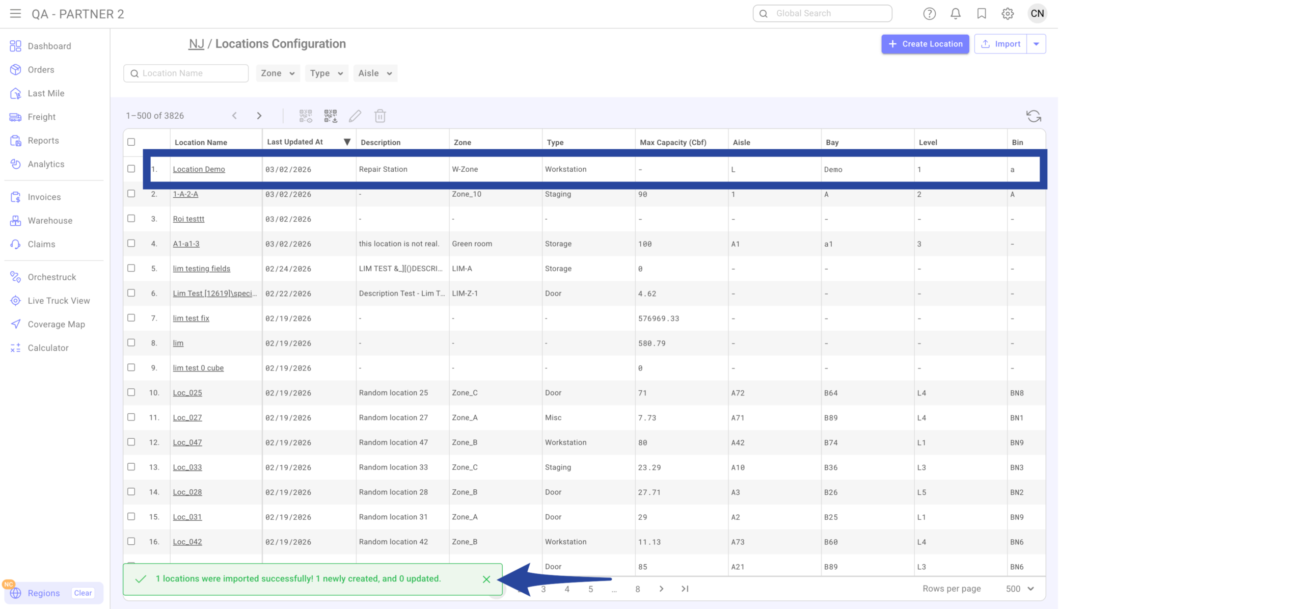 Confirmation that the location(s) has been successfully imported.