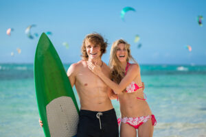young couple on beach with surfboard in arm surfin JPPLHWGjpg